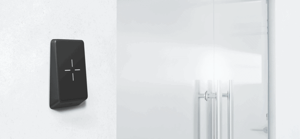 A white LED status indicates the door is ready to scan a credential.